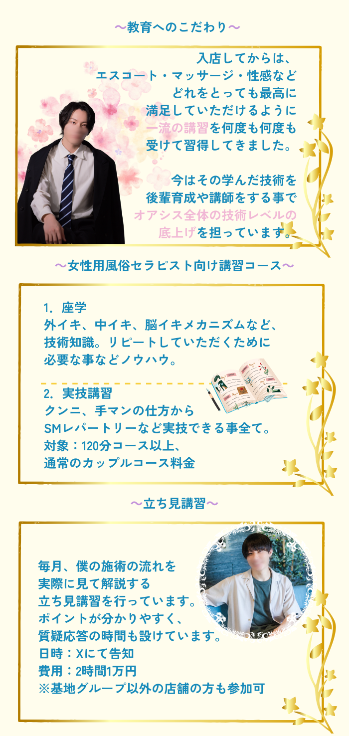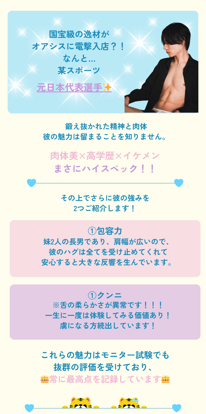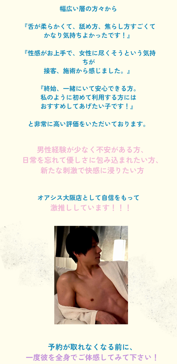 オアシス初利用でした。あすまくんを初めて予約させてもらってから1週間後に2度目の予約と再会、会ってる間はあすまくんに色々お任せしてますがエスコート力高くて細かい配慮とかもあり安心感が半端ないです。性感も目から鱗な話を聞けて現在の状態を分析できる高度な知識と経験を併せ持っているのでとても頼もしく思っています。かっこいいだけでなく高身長なので身長差も楽めて身体つきも素敵です。話題も尽きないのでとても居心地いいです。また来月も3回以上予約する予定でいるので会う度に気持ちいいと幸せを更新させてもらいます!