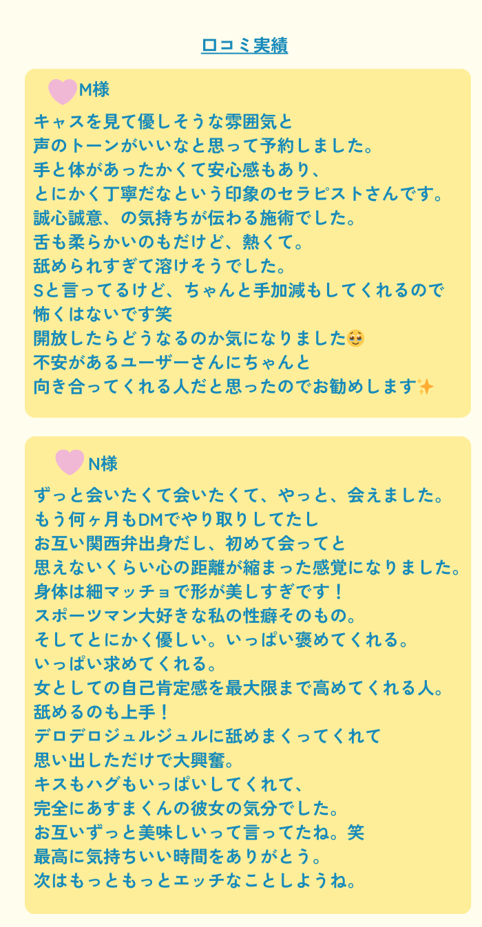 初めての女性用風俗でしたが、優しく丁寧に接していただいて、プロの技で気持ち良くしてもらいました!非日常を味わえるいい経験でした!