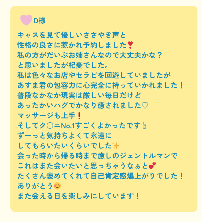 初めての女風があすまさんで良かったと心から思います。またぜひ指名させてください!