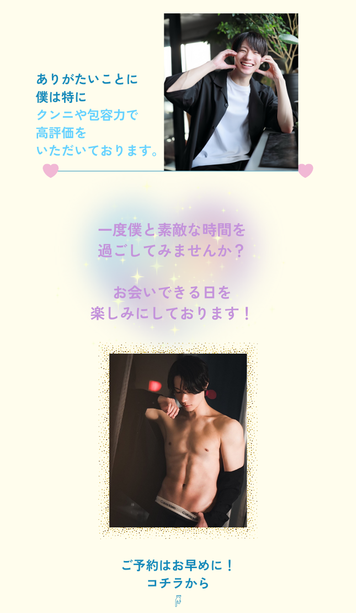 それでいて、施術では私こんなに気持ちよくなれるの!?って体験を毎回更新してくれるし(ほんとに感動レベル)、あすまくんに飽きる要素がなさすぎて困ってます、笑