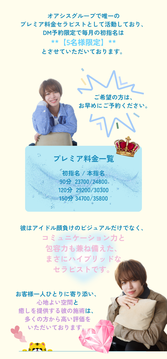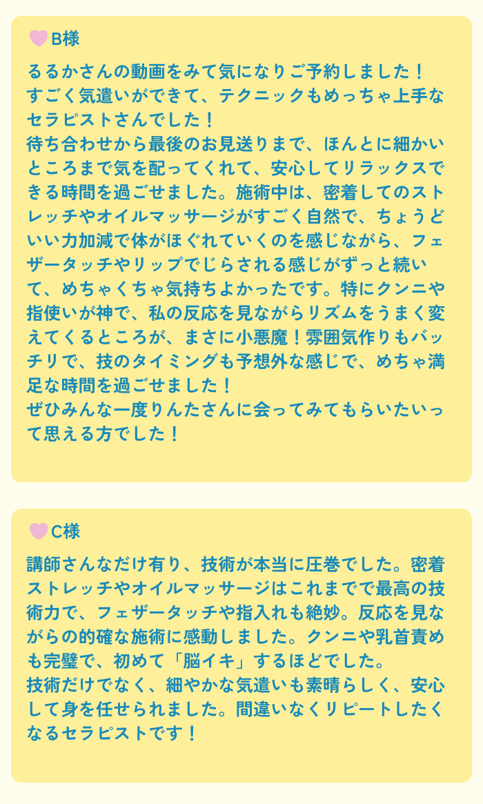 めちゃくちゃ緊張していましたが、優しくて面白くて、とても気遣いのできるセラピストさんだなーって思いました!