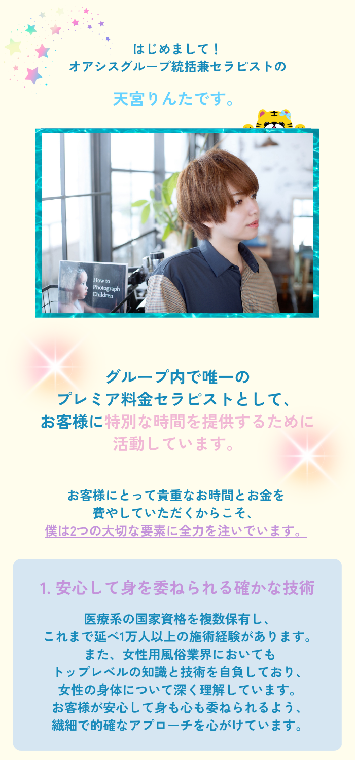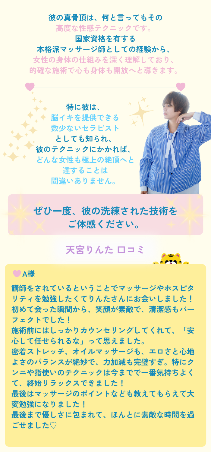わたしは恋人感を求めないがりんたさんが察してくれてイチャイチャ感の丁度いい塩梅ですごく優しいセラピストさんで次はもっと長い時間で呼びたくなりました️ありがとうございますりんたさんは、本当に優しい方です!甘えたくなるタイプです。