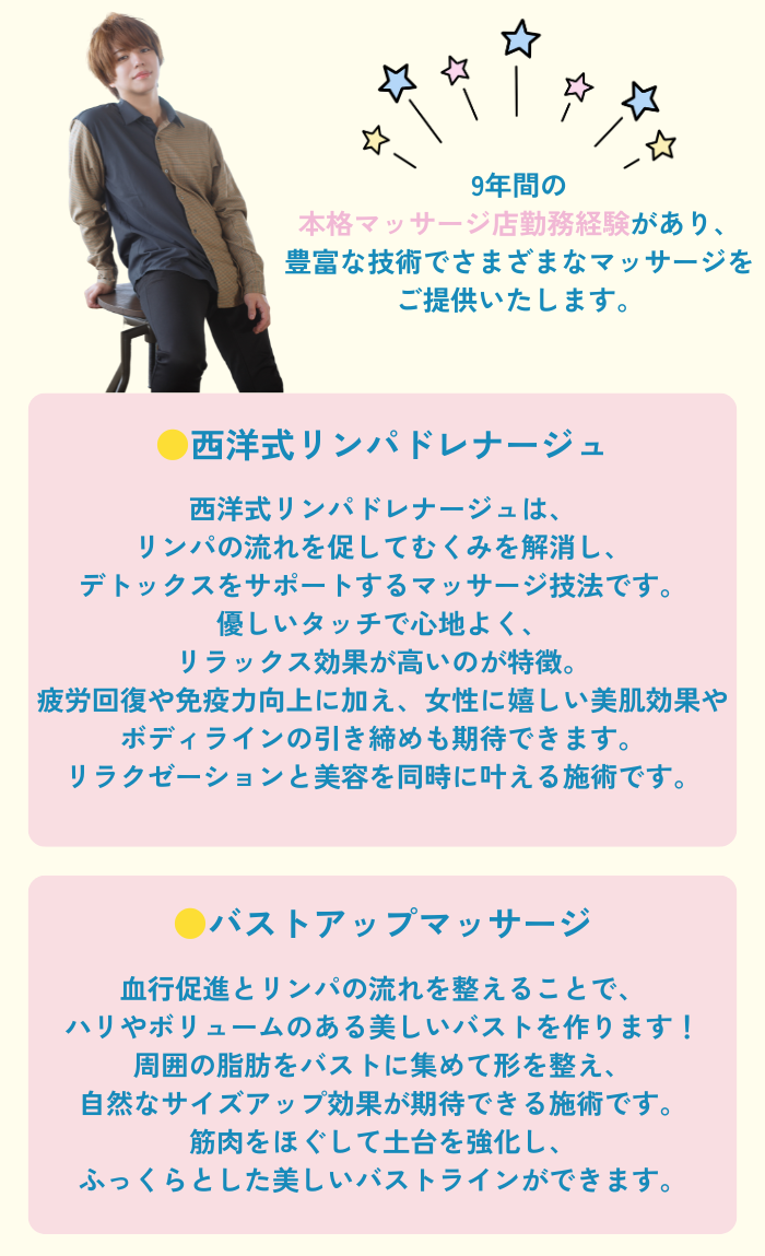 本物の整体師さんなので、技術が凄いです…!!肩がすっごく軽くなったので、ぜひ!受けて欲しいです!!