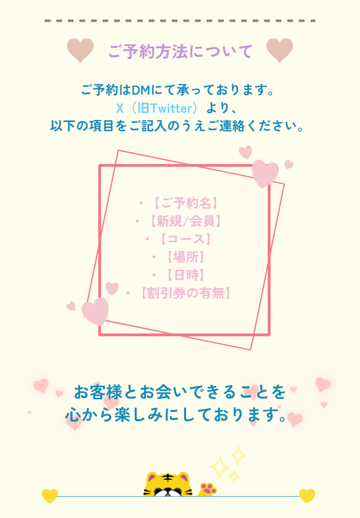 ご予約の際に、(ご利用日・セラピスト名・ハンドルネーム)を添えて「口コミ特典利用」とお伝えください。