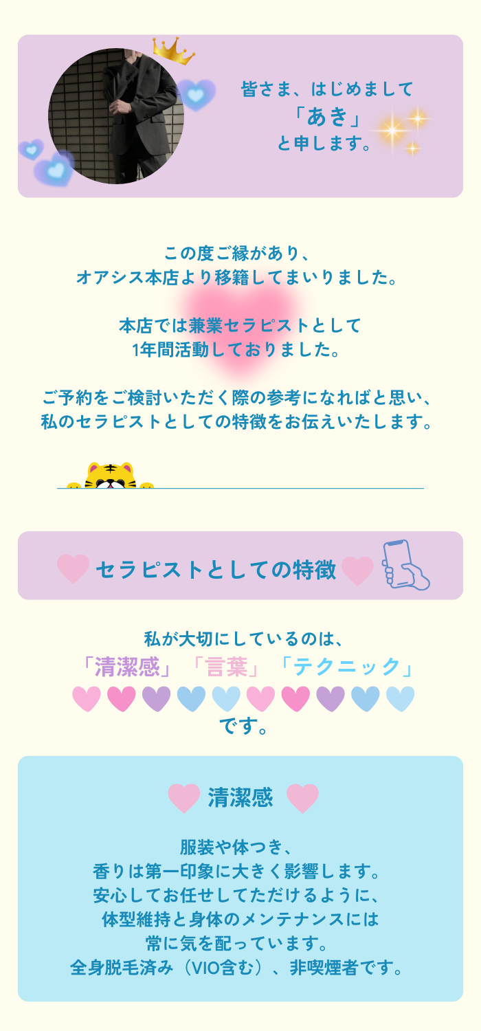 アキさんは優しいし、技術もすごく上手!絶対リピートしたくなるセラピストさんです~ アキさんと色んな話ができて、すごく楽しかったです!