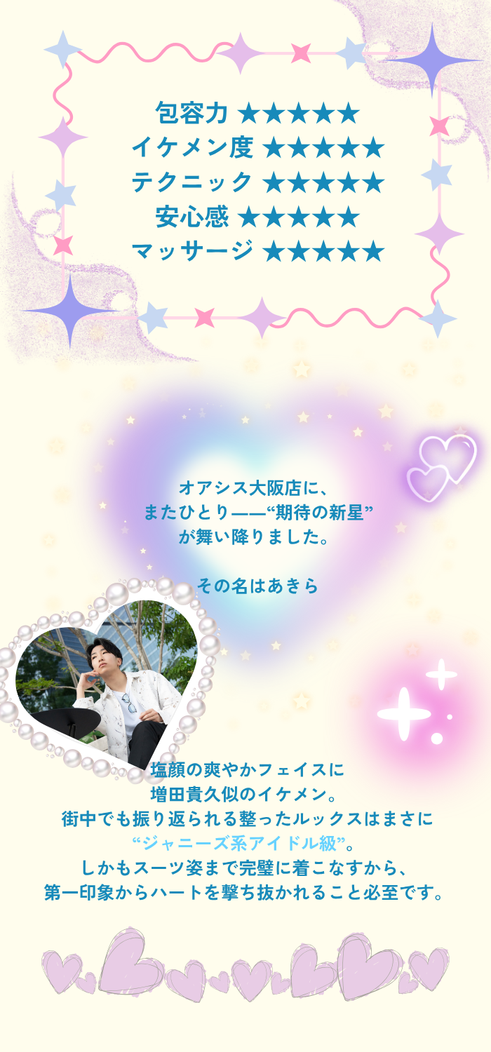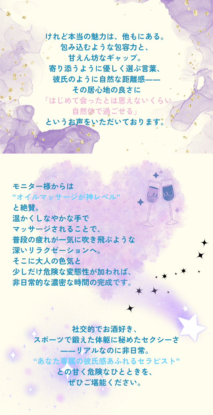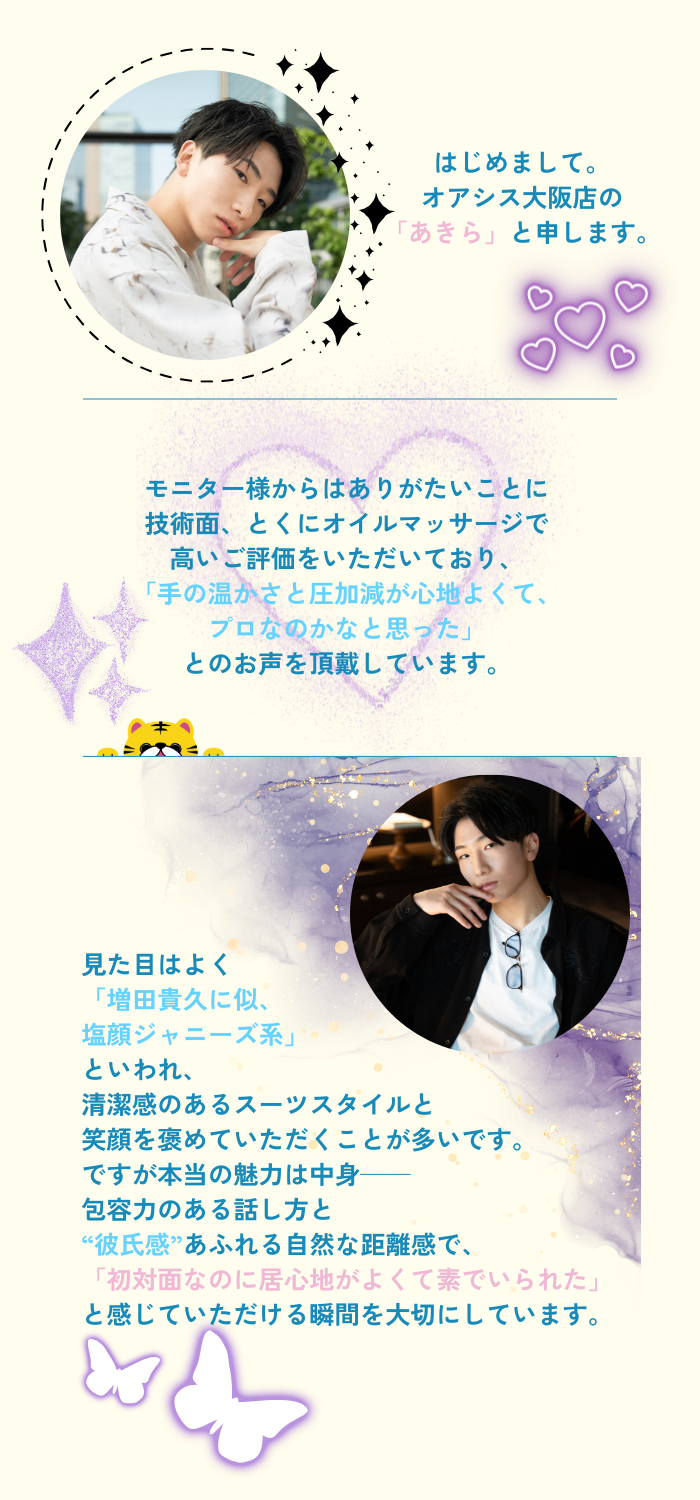 最近、仕事とプライベートでバタバタしてて、心も体もガチガチ…。そんな時、ふと検索して見つけたのがアキラさんでした。HPの雰囲気が良くて、「この人なら安心できそう」って直感で予約。