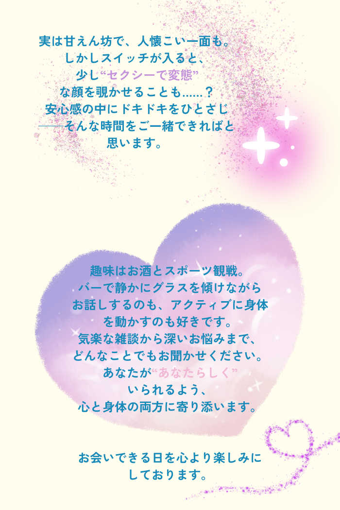 特にすごいなと思ったのは、包容力。ちょっとしたことでも「うんうん、そうだよね」って受け止めてくれて、まるでずっと前から知っている人みたいな安心感がありました。女性用風俗って少しハードルが高いイメージがあったけど、あきらさんと一緒にいると「ここなら自分を出していいんだ」と思えて、すごく楽になれました。