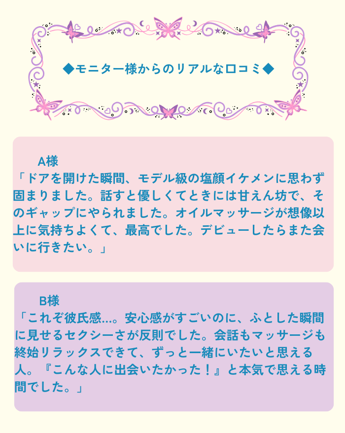 モニターで初めてお会いしました。最初は人見知りなのかな?と思ったけど、年齢が近くてタメ口にしよ〜ってなってかなり話が弾んで楽しかったです!マッサージも気持ちよくて、性感はほんまに新人!?って思うぐらい雰囲気作りもテクニックも凄かったです!