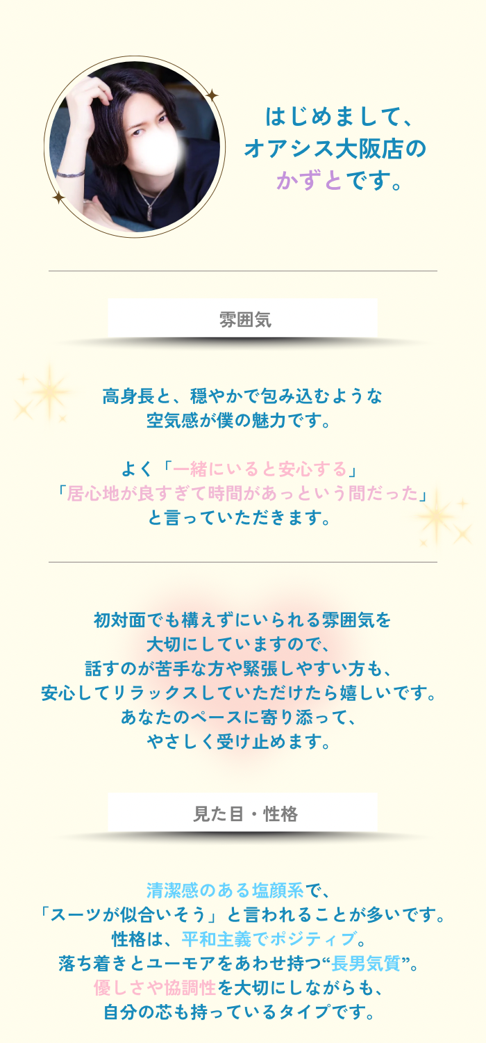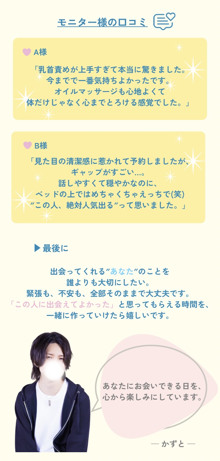 お会いするまではお腹が痛くなりそうなほど緊張していましたが、かずとさんの温かい柔らかい雰囲気でリラックスできました!
