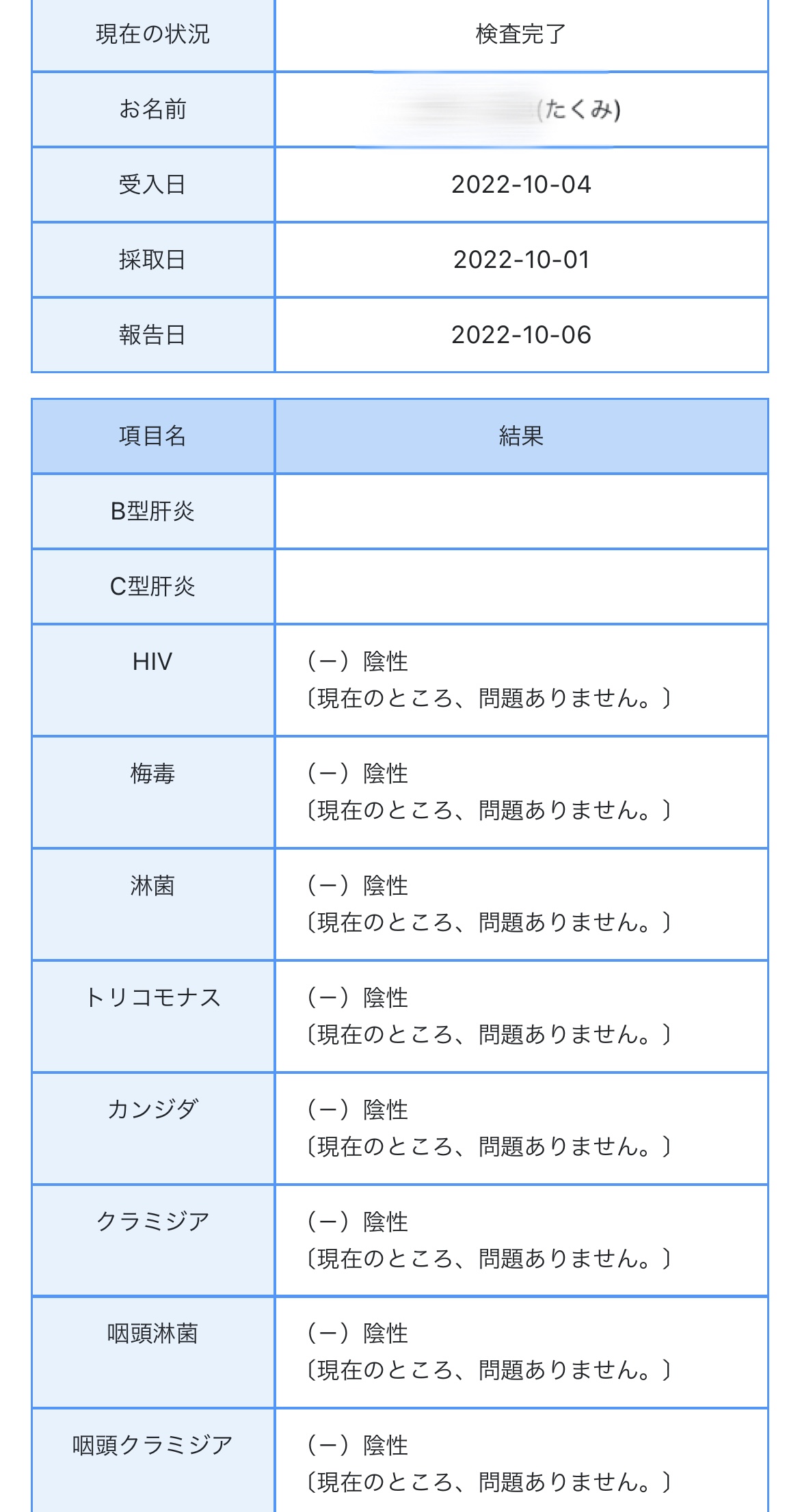 TAKUMI(タクミ) 9月度性病検査結果について。