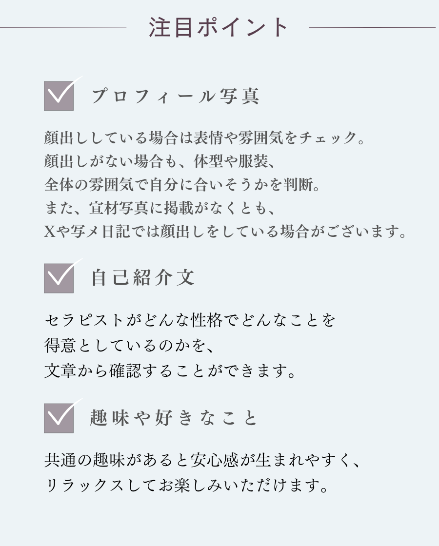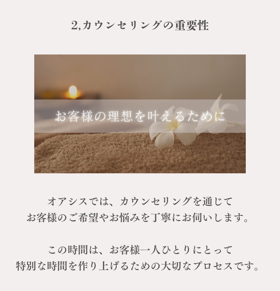 オアシスについて コンセプト 違い 女性用風俗とは ご利用までの流れ 予約 当日 サービス内容のご紹介 主なサービス カウンセリング セラピストの特徴と選び方 料金とシステム サービスごとの料金 お支払方法 キャンセルポリシー 最後に
