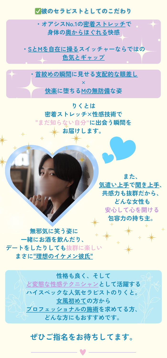 女性用風俗を利用する理由は様々だと思いますが、どんな理由で利用する方にも、りくとさんは刺さると思います!!