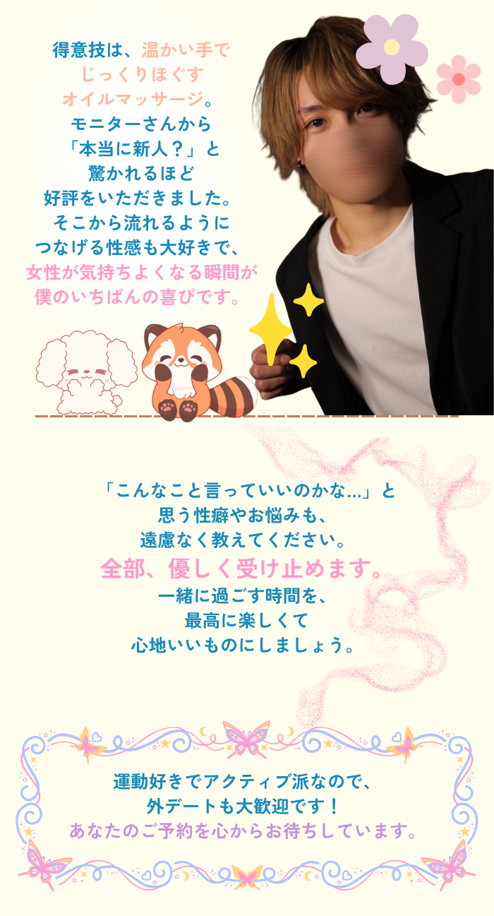 最初はとにかく丁寧で優しくて、まるで王子様のような接客にドキドキ。落ち着いた声と穏やかな笑顔で緊張もすぐにほどけました。どこまでも甘く包み込んでくれるような安心感。でも突然、ふいに甘えてくる瞬間があって…そのギャップに完全にやられました。普段は大人の余裕たっぷりなのに、時々見せる無邪気な一面がたまらなく可愛い。だけどやっぱり根本はかっこよくて、リードもスマート。心も体も全部委ねたくなるような時間でした。また絶対お願いしたいです。