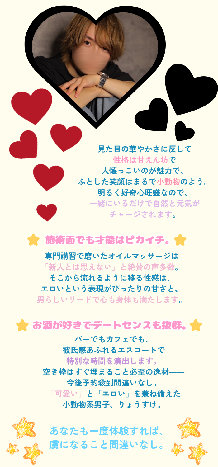 仕事で肩も腰もバキバキだったので、エロより“マッサージ重視”でお願いしたくてりょうすけ君を指名✨ 甘い笑顔とは裏腹に、施術が本格的すぎてびっくりしました😳 指圧もオイルもツボにバッチリ入って、痛気持ちよさがクセになる💆♀️✨ そして何より、りょうすけ君の“手の温もり”が本当に心地よくて…触れられるだけでほっとするの🫶 肌もすべすべで密着感も最高だし、キスはとろけるほど甘くて、全身が癒されました💋 疲れが吹っ飛んだ〜!
